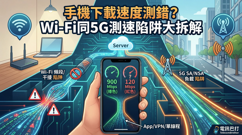 手機上下載速度, Wi‑Fi同5G測速陷阱, download speed, speed test, Wi‑Fi 測速, 5G 測速, Router 設定, 5GHz, 6GHz, 回程(backhaul), 網絡負載, 伺服器選擇, 手機測速點樣先準?, Wi‑Fi 2.4GHz 點解測速咁慢?, 點解 5G 滿格但 download speed 好低?, 同一個 speed test App 點解結果差咁遠?, 屋企 1Gbps 寬頻手機只得 200Mbps 正常嗎?, 用 VPN 會唔會影響測速?, 點揀測速伺服器先唔會量錯?, 5G 繁忙時段慢係咪計劃問題?