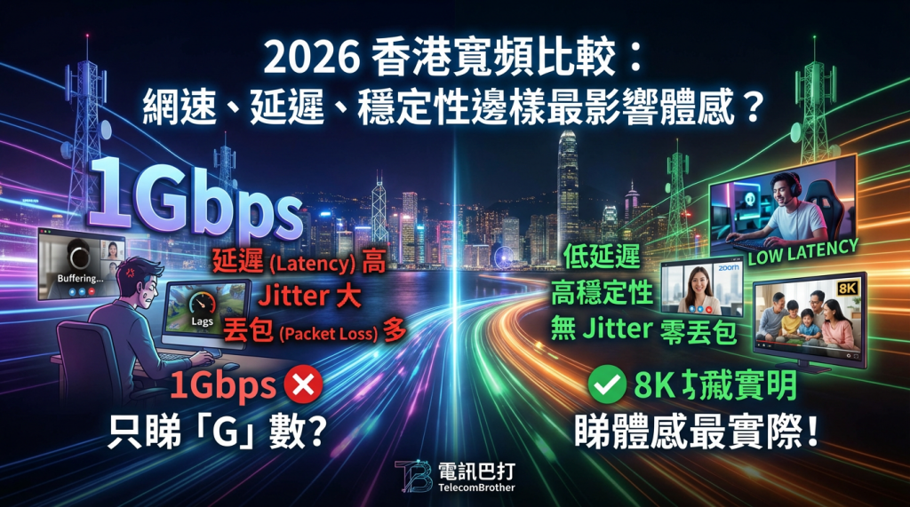 2026 香港寬頻比較, 香港寬頻延遲, 香港寬頻穩定性, 香港寬頻 jitter, 香港寬頻丟包, FTTH FTTP, FTTB 光纖到大廈, 5G 家居寬頻, 香港寬頻網速, 香港 1Gbps 寬頻點解都覺得慢, 打機應該揀低延遲定高網速寬頻, Zoom 成日爆音係寬頻問題定 Wi-Fi 問題, 繁忙時間 8-11pm 寬頻慢點測試, FTTH 同 FTTB 體感差幾多, 5G 家居寬頻穩唔穩要睇咩, 村屋裝寬頻穩定性點樣先算好, 唐樓光纖入到大廈但入唔到屋點算, 寬頻 jitter 高點改善 Router 擺位, 寬頻丟包會唔會影響 Netflix 同打機