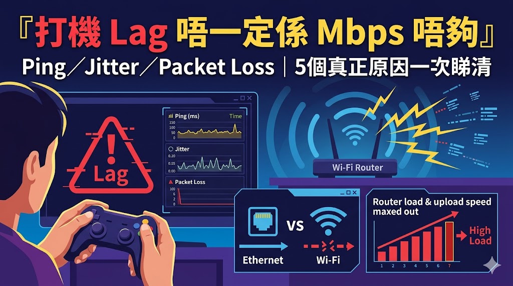 打機 lag, Mbps, Wi‑Fi, Router, 5G, ping, packet loss, 寬頻, 香港寬頻, 打機lag係咪因為Mbps唔夠, 打機ping高點算好, Wi‑Fi打機成日飄點搞, Router bufferbloat 令打機lag點解, 5G打機會唔會唔穩, 點check packet loss 影響打機, 上載被食滿打機會唔會lag, 有線打機順Wi‑Fi唔順點排查, 晚高峰打機lag係咪ISP問題, 村屋打機Wi‑Fi唔穩點改善