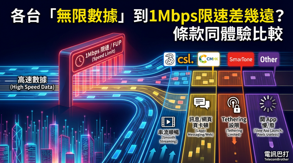 無限數據, 1Mbps限速, 公平使用政策, 網絡管理, 限速後, 實測, 轉台, 條款比較, 上台揀Plan, hotspot限制, 無限數據用晒之後1Mbps仲用唔用到YouTube?, 1Mbps限速睇片會唔會不停轉圈?, 各台1Mbps限速體感點解差咁遠?, 公平使用政策FUP係咪等於二次限速?, 限速後開hotspot分享上網會唔會更慢?, 港鐵繁忙時間1Mbps限速仲上唔上到網?, 轉台點睇條款灰位先唔會中伏?, 1Mbps限速打機延遲會唔會好飄?, 限速後VPN同遠端桌面仲做唔做到?, 點用日常情境實測邊台限速段最穩?