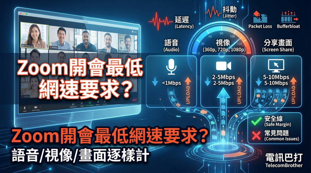 Zoom開會最低網速要求, Zoom最低網速, Zoom語音網速要求, Zoom視像網速要求, Zoom分享畫面網速要求, Zoom會議網速要求, Zoom數據用量, Zoom卡, Wi‑Fi Zoom, 5G Zoom, 寬頻比較, 流動網絡比較, Zoom開會要幾多Mbps先唔會卡, Zoom share screen 要幾多上載先夠用, Zoom 720p 視像最低網速係幾多, 用手機 hotspot 開 Zoom 點樣先穩定, Zoom 聲斷係咪 packet loss 太高, Zoom 1080p 一個鐘用幾多數據, Wi‑Fi 2.4GHz 開 Zoom 點解成日窒, 開 Zoom 但 speedtest 好快都會卡點解