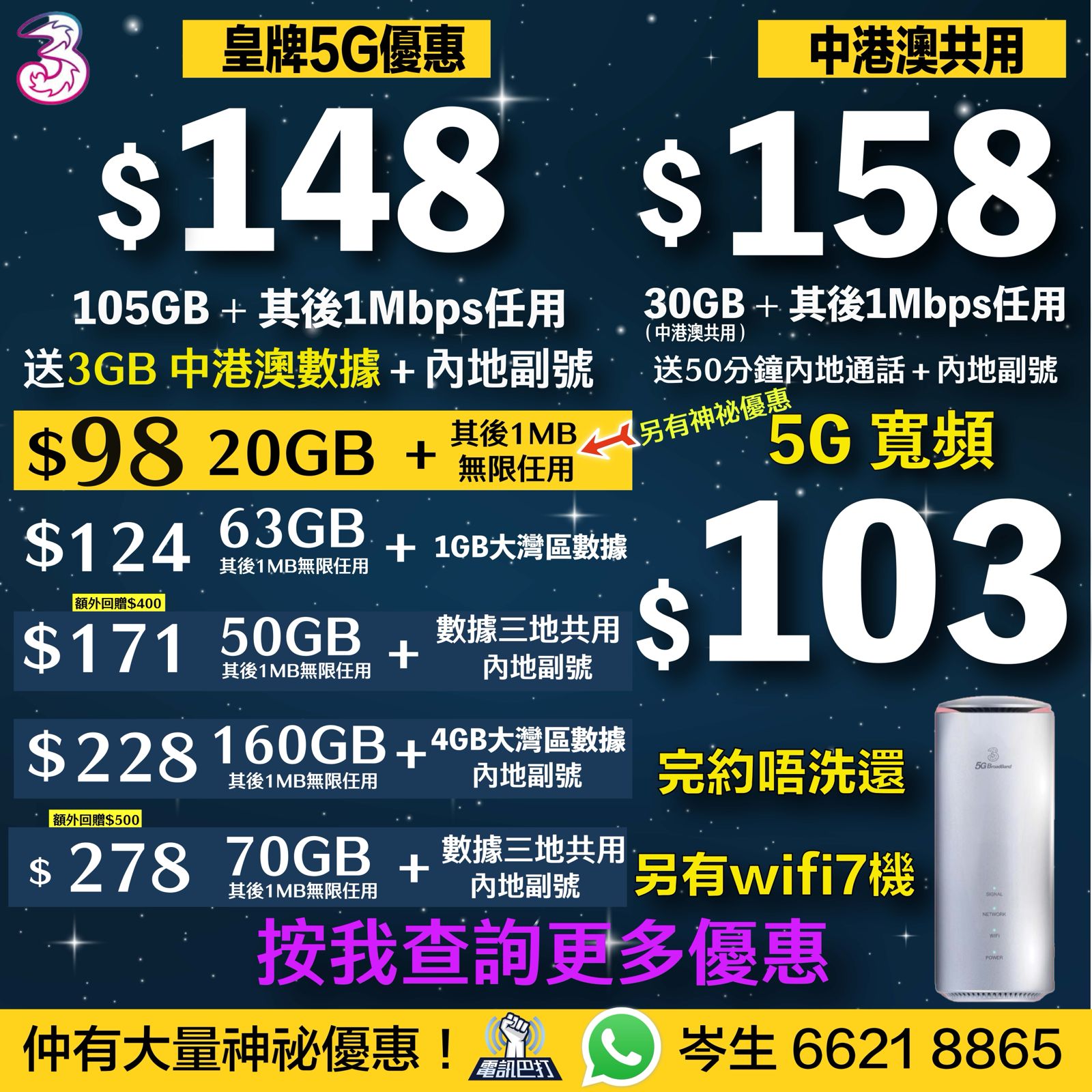 【3香港5G月費計劃】本地・大灣區・世界・亞太月費低至$98起