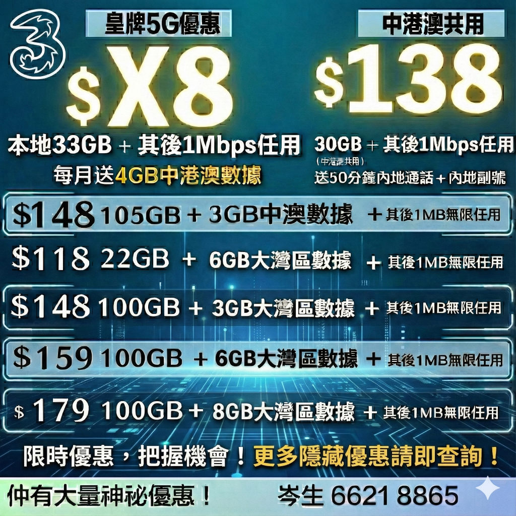 1月2日更新!3HK 5G月費低至$X8起 每月33GB數據 送4GB中澳數據+13個社交數據任用