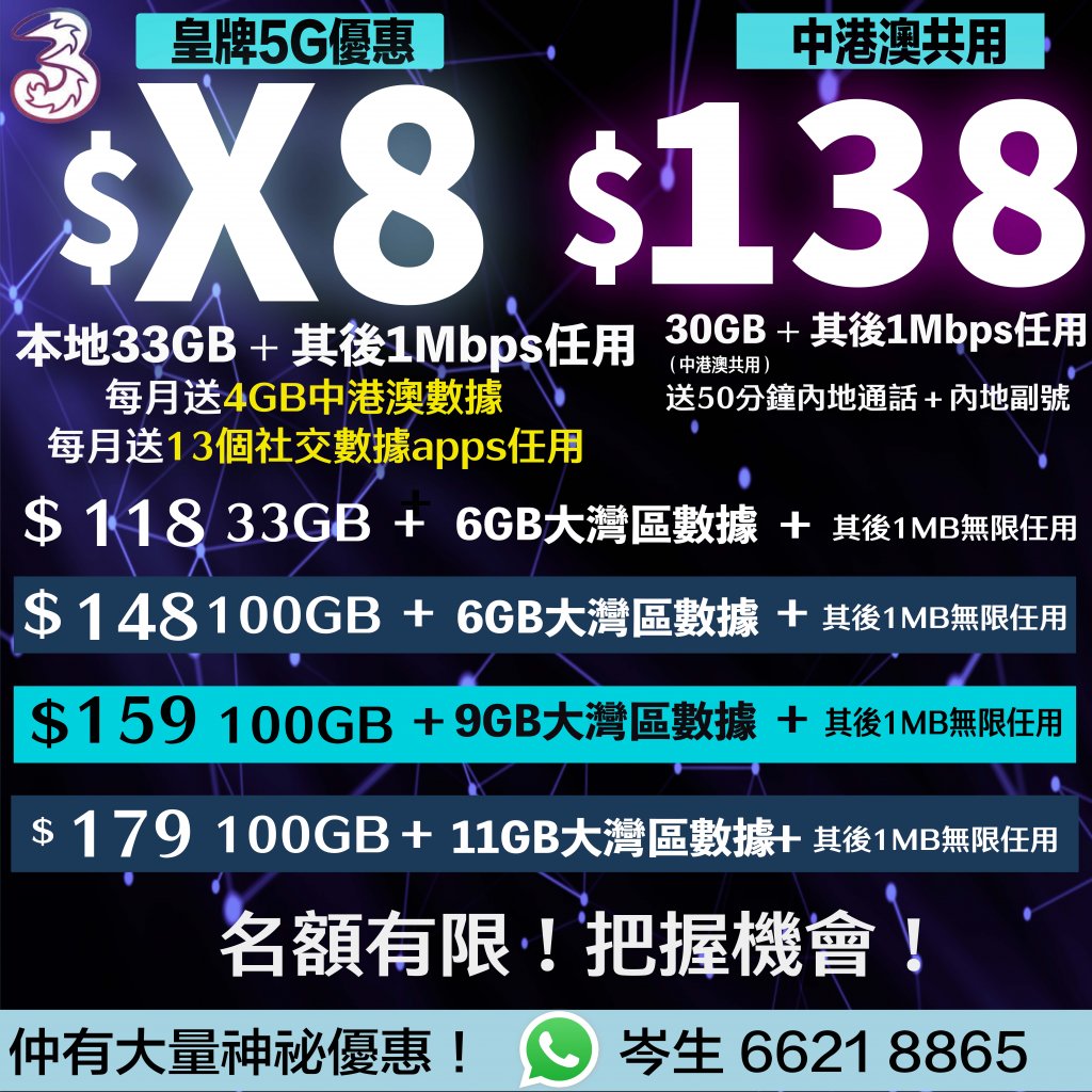 1月18日更新!3HK 5G月費低至$X8起 每月33GB數據 送4GB中澳數據+13個社交數據任用