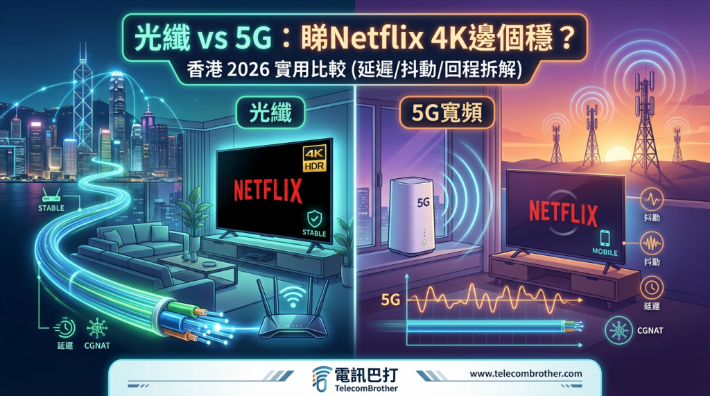 #光纖 vs 5G寬頻, Netflix 4K, 光纖寬頻, 5G寬頻, 5G 家居寬頻, 香港寬頻比較, Wi‑Fi 7 Router, 繁忙時段, 抖動 jitter, CDN, 光纖同 5G 寬頻睇 Netflix 4K 邊個穩?, 5G 家居寬頻夜晚繁忙時段會唔會卡?, 村屋裝 5G 寬頻睇 4K 夠唔夠穩?, 唐樓拉唔到光纖用 5G 寬頻得唔得?, Netflix 4K 成日跌 1080p 係咪 Wi‑Fi 問題?, 點樣用 Fast.com/長播測試寬頻穩定度?, 5G Router 擺窗邊同擺入房差幾遠?, 光纖 1Gbps 同 2Gbps 煲劇有冇分別?
