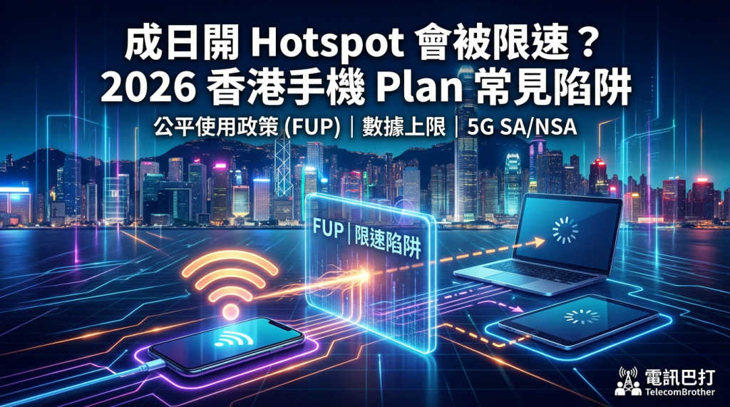 Hotspot 限速, 香港手機 Plan, 公平使用政策, FUP, hotspot 數據上限, speed cap, 5G 覆蓋, 擁塞管理, APN, DPI, TTL, 分享上網, 成日開 Hotspot 會唔會被限速, Hotspot 另計數據點睇條款, 無限數據係咪一定全速, 點分辨係 FUP 降速定網絡擁塞, 插卡入 Router 會唔會慢過手機分享, 5G SA 同 NSA 會唔會影響 Hotspot 穩定, Hotspot cap 5Mbps 仲夠唔夠開會, 晚繁 Hotspot 忽快忽慢點算, YouTube 畫質上唔到係咪被限速, Speedtest 好快但 Zoom 仍然窒係咩原因