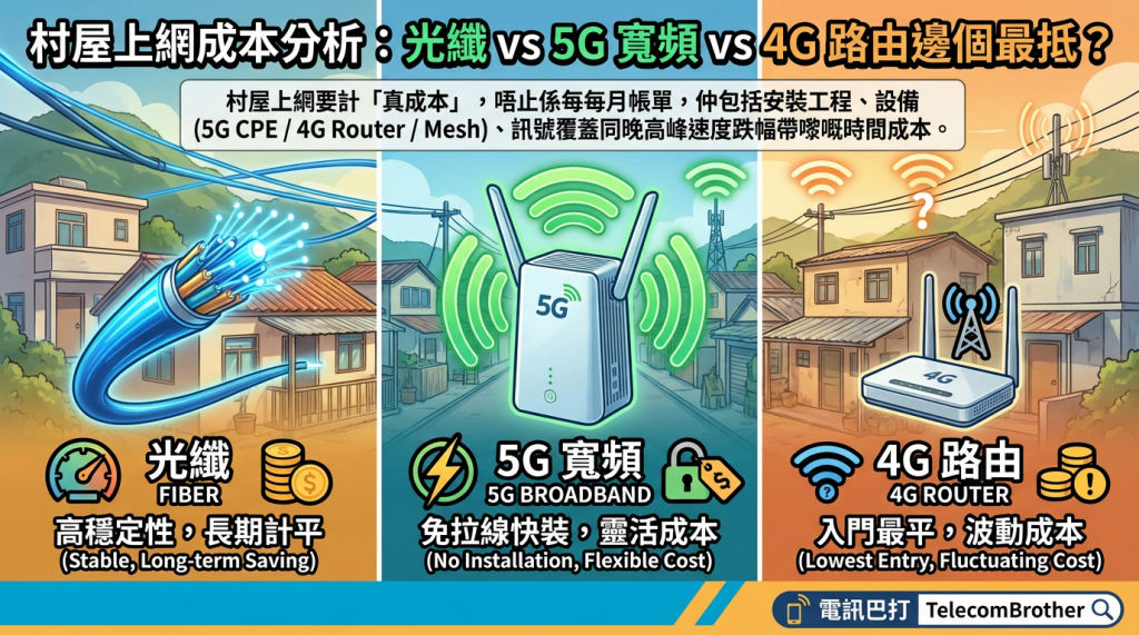 村屋上網成本分析, 村屋上網, 村屋光纖入屋, 村屋 5G 寬頻, 村屋 4G Router, 36 個月總擁有成本, 村屋 Ping, 晚高峰擠塞, 外置天線, Mesh Wi-Fi, 村屋裝光纖要幾多錢?工程費點計?, 村屋用 5G 寬頻會唔會晚高峰慢?, 村屋用 4G Router 夠唔夠用?打機得唔得?, 丁屋分層出租用光纖定 5G 好?, 村屋 5G 要唔要加外置天線先穩?, 村屋多層屋 Wi‑Fi 死角點搞?要唔要 Mesh?, 村屋上網點計 36 個月總成本先算抵?, 等光纖期間用 4G/5G 過渡點揀?, 村屋上網 Ping 高點解?點改善?, 村屋搬屋轉台成本高唔高?點避坑?