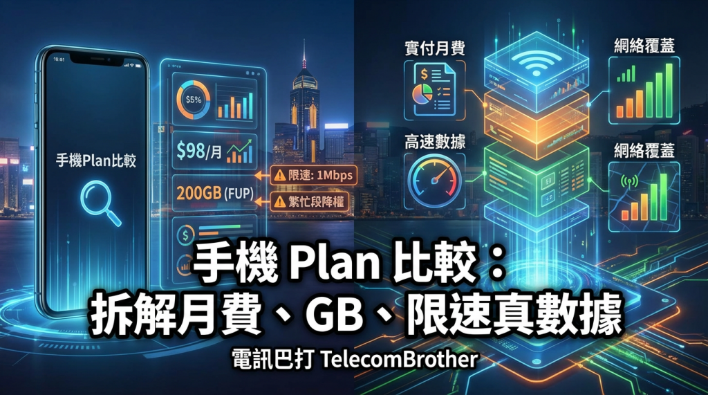 手機Plan比較方法, 月費比較, GB 比較, 限速條款, 公平使用政策, 繁忙時段, 5G 覆蓋, 熱點 tethering, 大灣區漫遊, 合約期總成本, ping jitter, 手機plan 點樣比較月費先準, 限速 1Mbps 2Mbps 其實用唔用到, 無限數據係咪真係無限高速, 公平使用政策 FUP 點睇唔中伏, 用手機開熱點會唔會提早限速, 繁忙時段網絡慢係咪被降權, 大灣區漫遊數據係獨立包定共享, 轉台提早完約要賠幾多, 點樣用 ping jitter 比較打機上網, 雙卡 eSIM 點分主卡收碼同數據卡