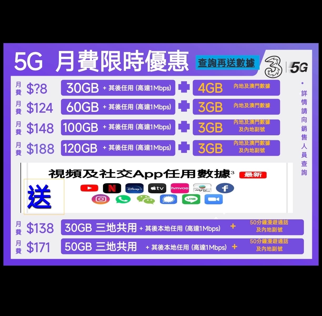 - 3香港提供多款上網計劃,包括500GB 全速+無限 IDP,或 真無限 5G 上網,月費由 $134 至 $193 不等。