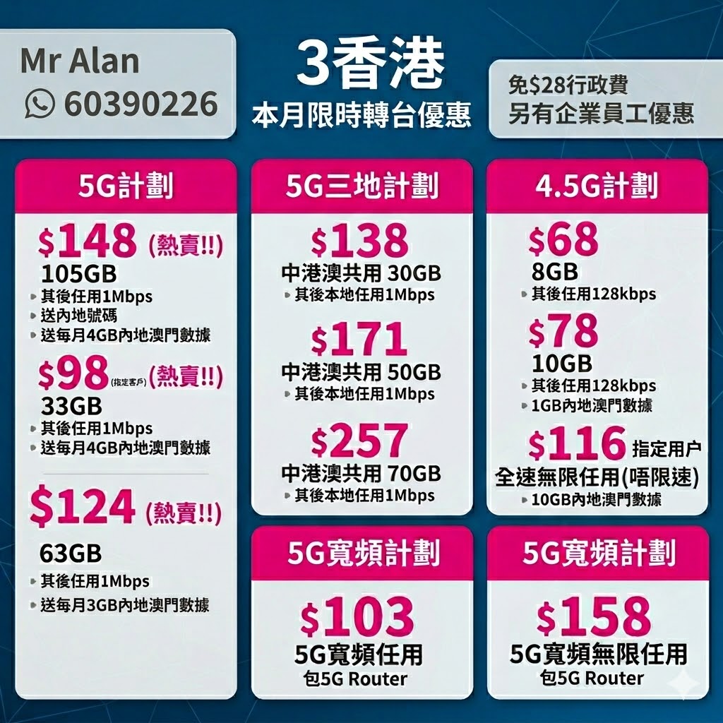 3香港商業5G手機上台月費低至$11x起