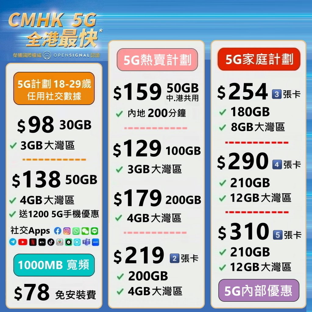 - 🔥5G-$138,50GB+4GB大灣區數據,送$1200回贈抵扣月費