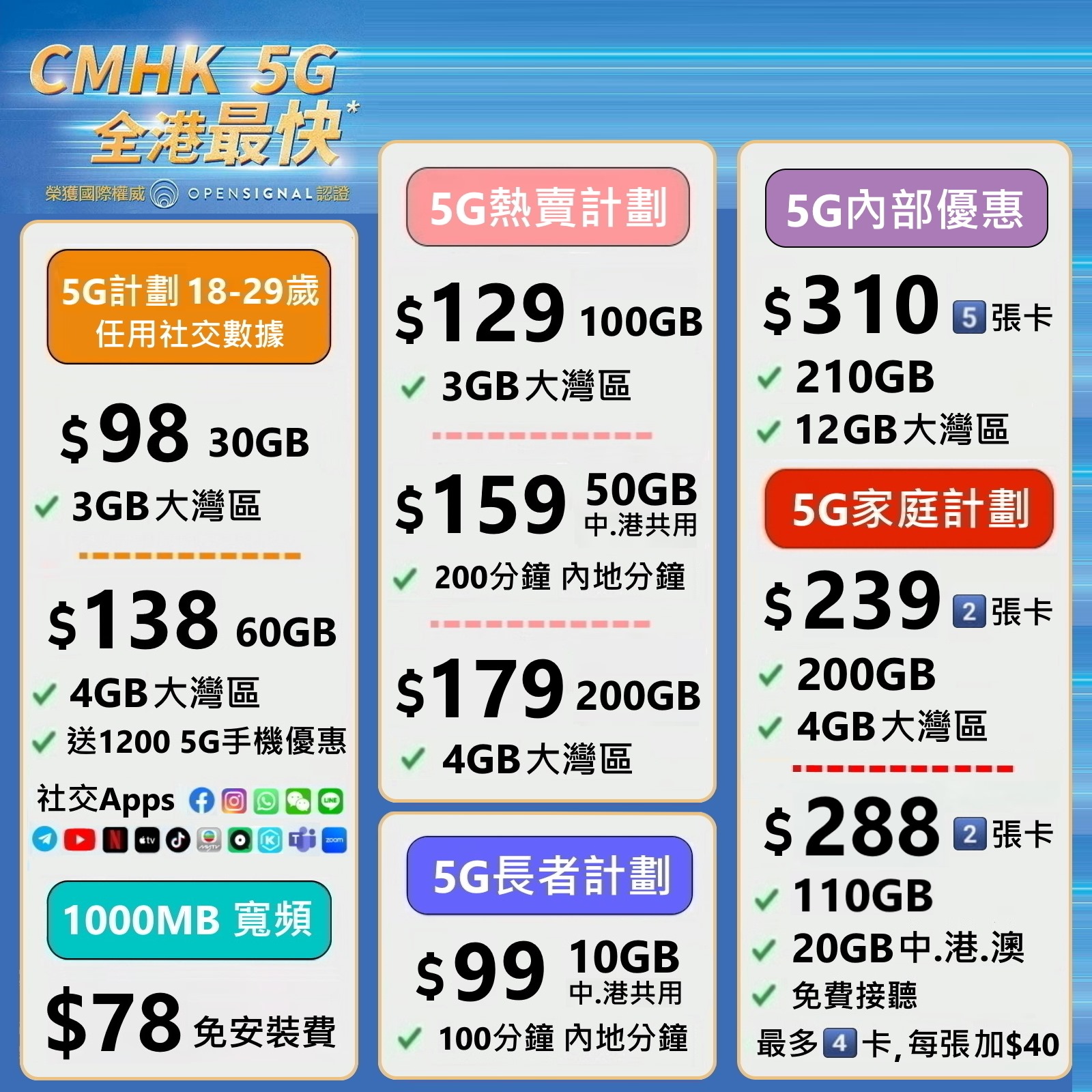 CMHK⭐$239 / 2️⃣0️⃣0️⃣GB(家庭2卡計劃)❗限時❗ 送買機回贈,積分優惠