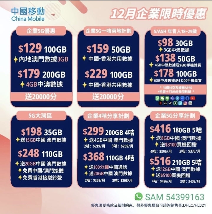 中國移動5G轉台快閃優惠月費企業 $129 50GB起!