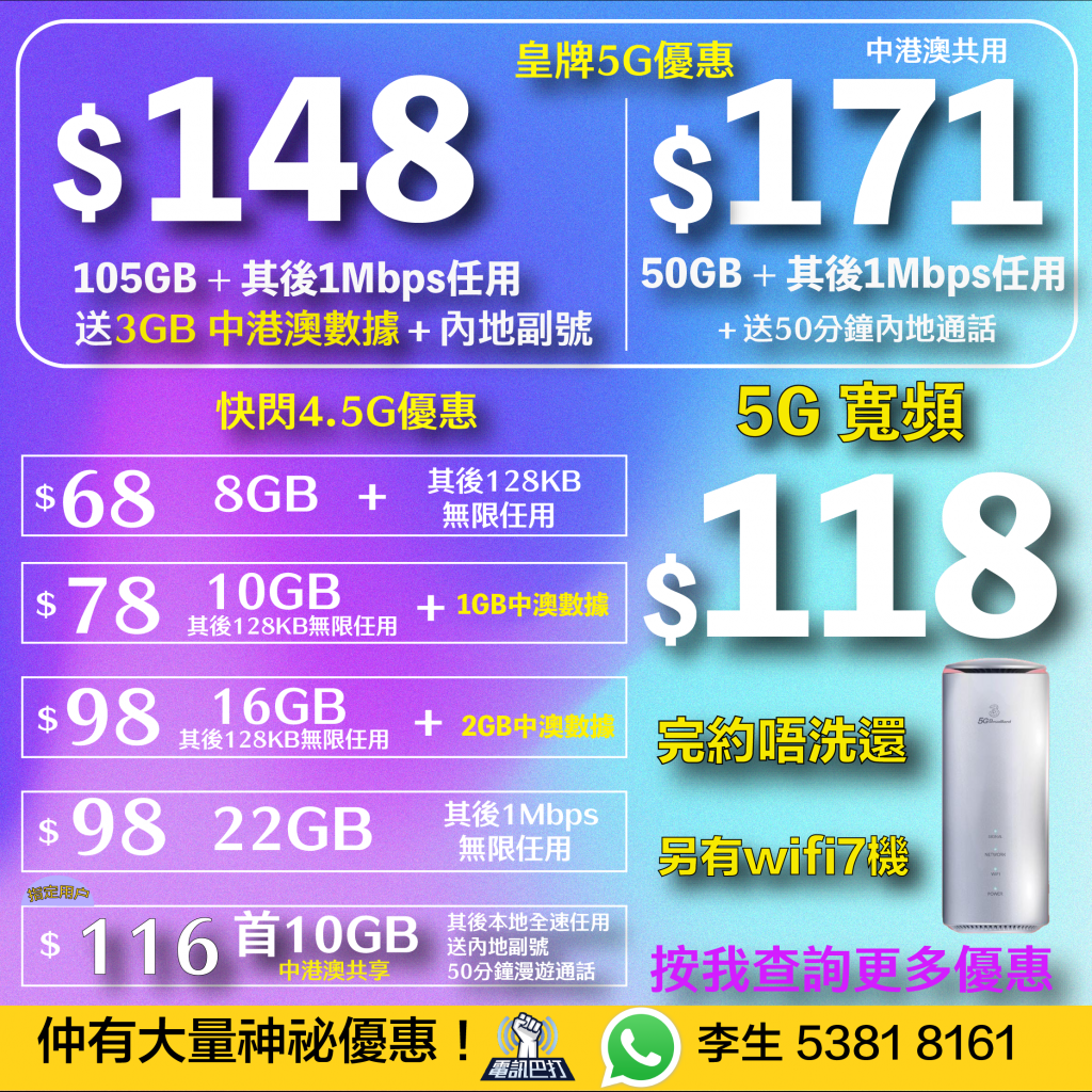 - 🔥$129 5G網絡 50GB本地數據後1Mbps無限上網 24個月合約 📞無限通話分鐘☃️贈送大灣區數據2GB