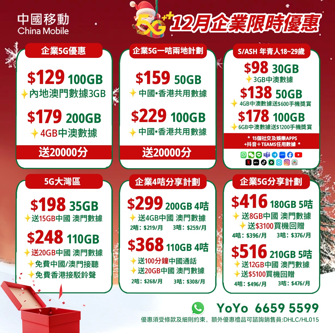 🪅 最齊,最全,最新,中國移動📣12月限時半價快閃!5G 📱iPhone出機Plan,送你 $100 月費回贈🔥即係越用越抵!