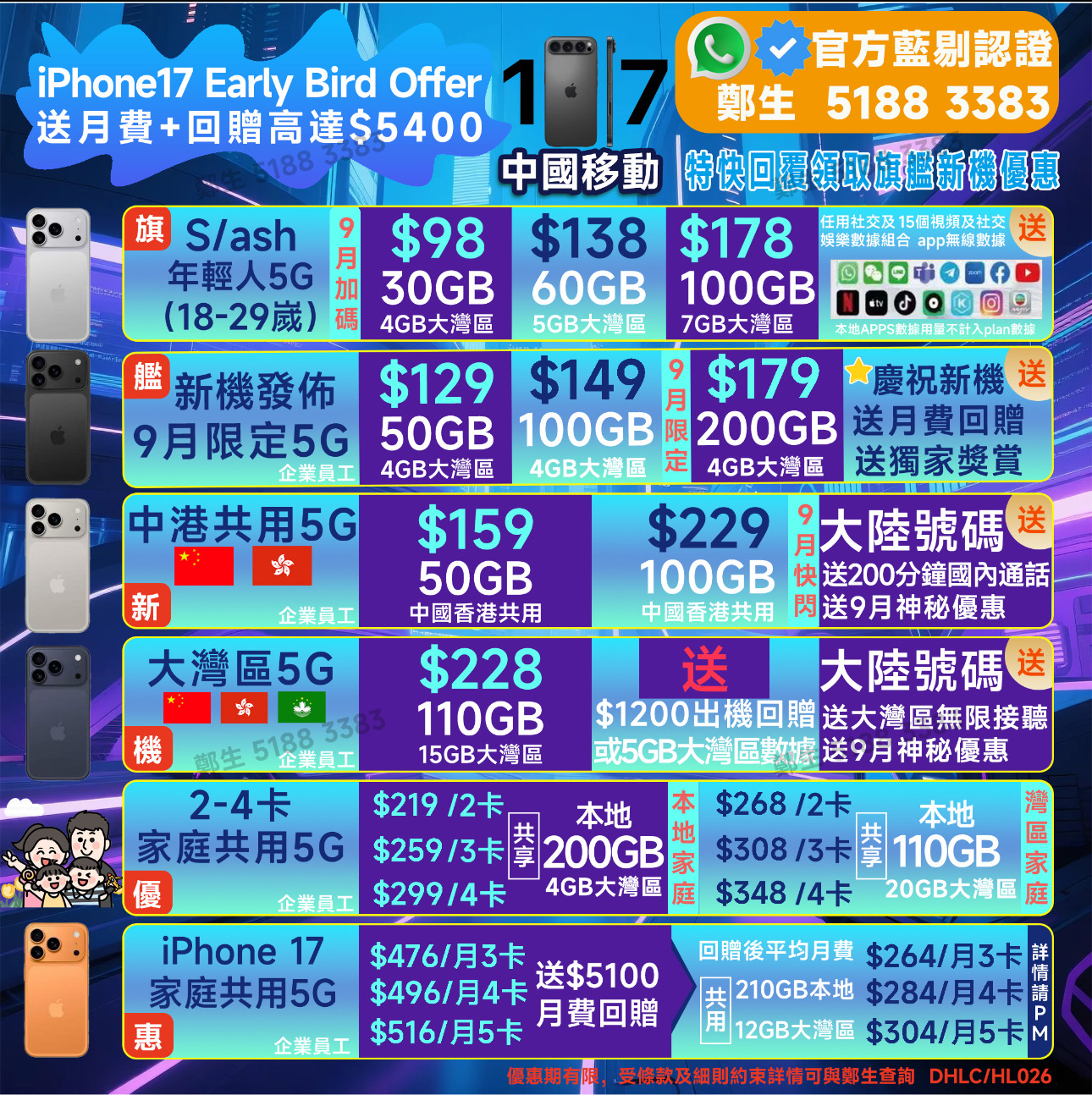 - 🥇9月限定5G$130/100GB+4GB大灣區秒殺