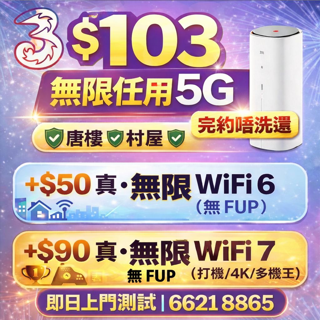【3HK 5G家居寬頻優惠】月費$103起 免拉線|即插即用|WiFi6/7 Router 免費送|最快即日上門測試