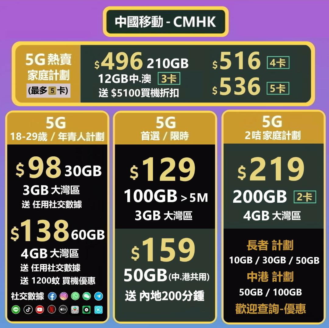 CMHK⭐$251 / 2️⃣1️⃣0️⃣GB(家庭5卡計劃)❗限時❗ 送買機回贈,積分優惠