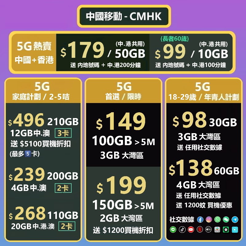 中國移動🇭🇰最新offer 5G $129 50GB / $149 100GB / $179 200GB