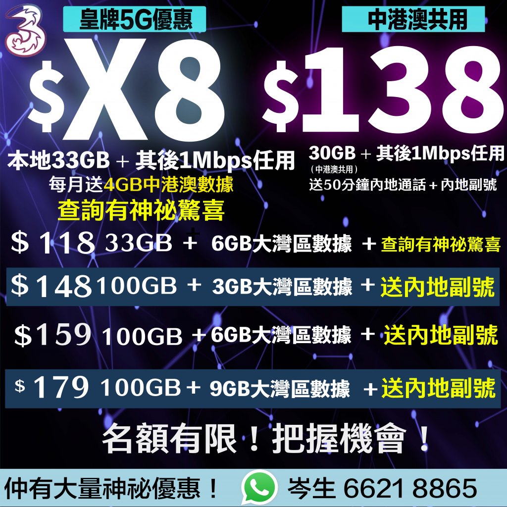1月30日更新!3HK 5G月費低至$X8起 每月33GB數據 送4GB中澳數據