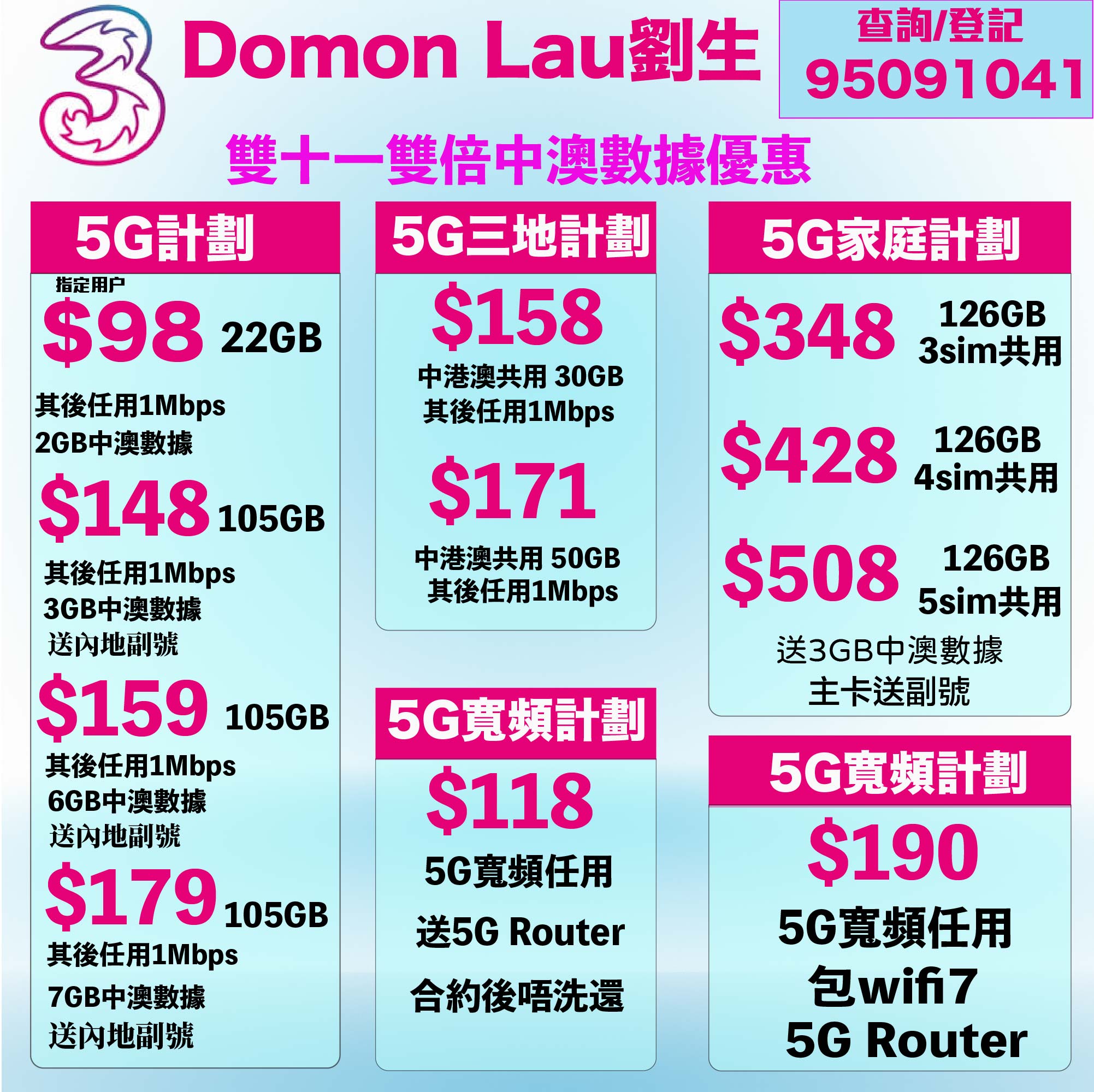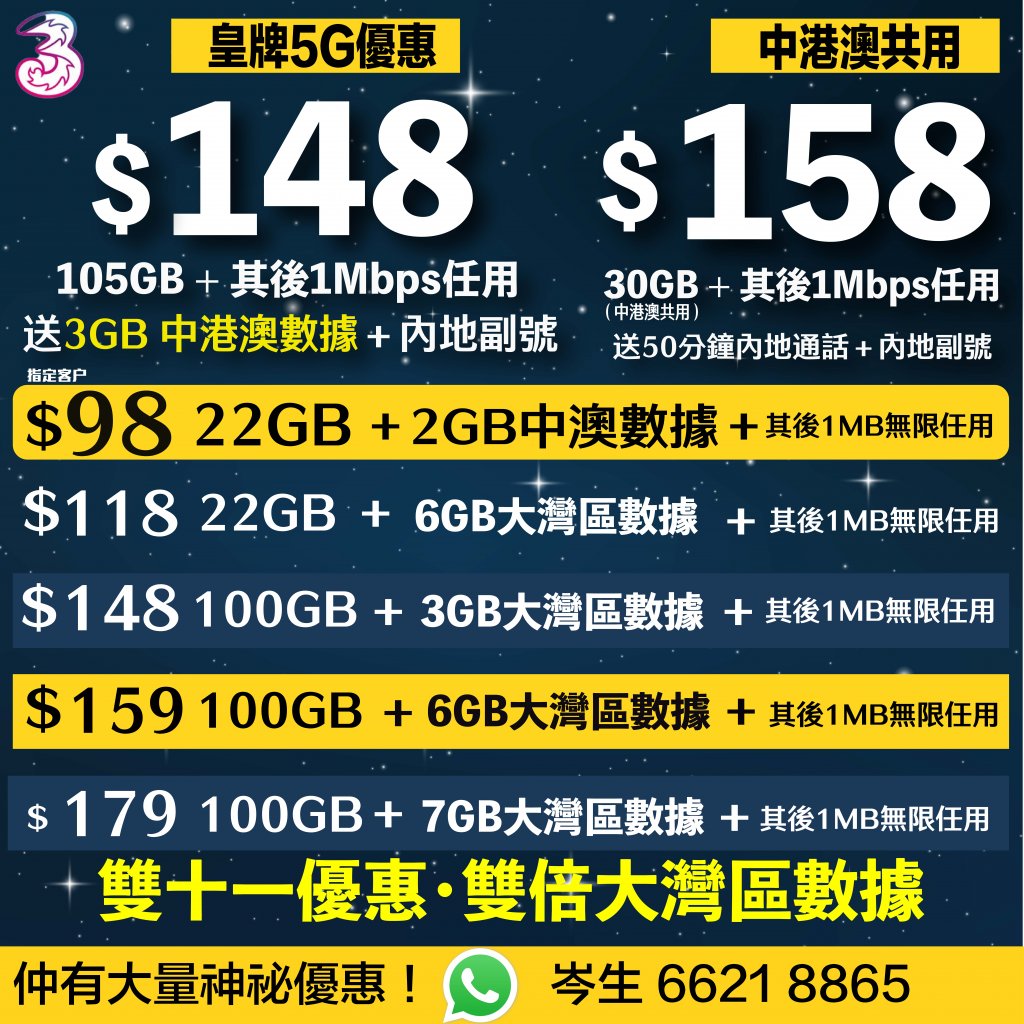 11月7日更新!【3香港5G月費計劃】本地・大灣區・世界・亞太月費低至$98起