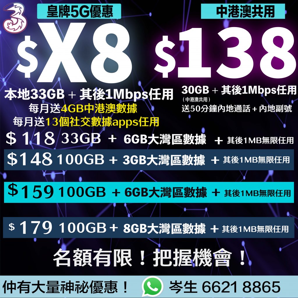 1月16日更新!3HK 5G月費低至$X8起 每月33GB數據 送4GB中澳數據+13個社交數據任用