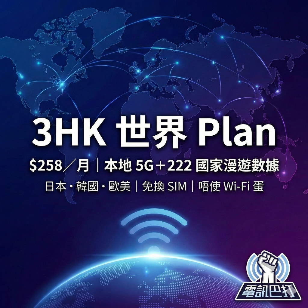 3HK 世界 Plan 月費 $258 起,包本地 5G+222 個國家及地區漫遊數據,日本、韓國、歐美落機即用,免換 SIM 卡、唔使租 Wi-Fi 蛋。【電訊巴打】幫你分析亞太同環球 Plan 點揀先啱。